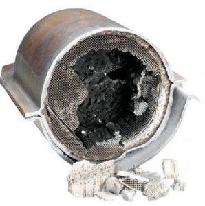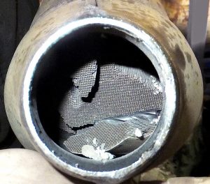 The catalyst inside a catalytic converter is made from a lightweight, thin-walled, fragile material that looks similar to honeycomb with an insulation mat protecting it. This mat holds the catalyst in place and provides some protection against damage. However, a rock or road debris striking the converter, improper or broken exhaust hangers can cause the catalyst to break. Once the catalyst is broken, the broken pieces become loose, rattle around and break up into smaller pieces. Flow in interrupted and back pressure in the exhaust system increases. This leads to heat build-up and loss of power.